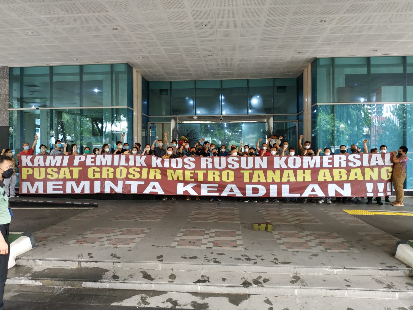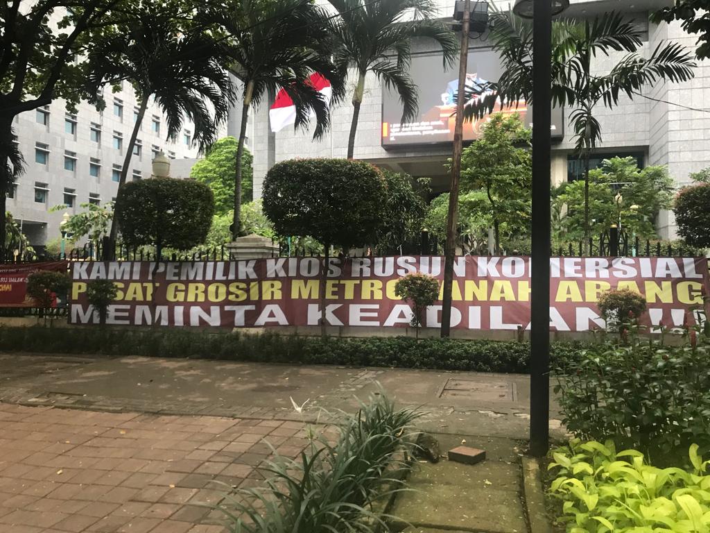 Mereka juga membentangkan dua spanduk bertuliskan “Kami Pemilik Kios Rusun Komersial Pusat Grosir Tanah Abang Meminta Keadilan!!” dan “Kami Pemilik Kios Rusun Komersial Pusat Grosir Tanah Abang Menolak Penggabungan Sertifikat PGMTA 1 dan PGMTA 2”.